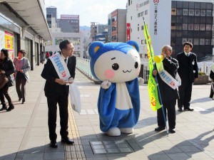 開会式で障団連の北原守会長(育成会会長)は、「共生のまちづくりには市民の障害者理解が不可欠であり、今回のキャンペーン活動もその一つ、寒さに負けず頑張ろう」と訴えました。また、北九州市の工藤一成保健福祉局長や同市議会の戸町武弘議長も、来年4月から施行される障害者差別解消法について触れ、「今回の活動が市民の差別意識の解消に繋がっていく」と参加者を励ましました。